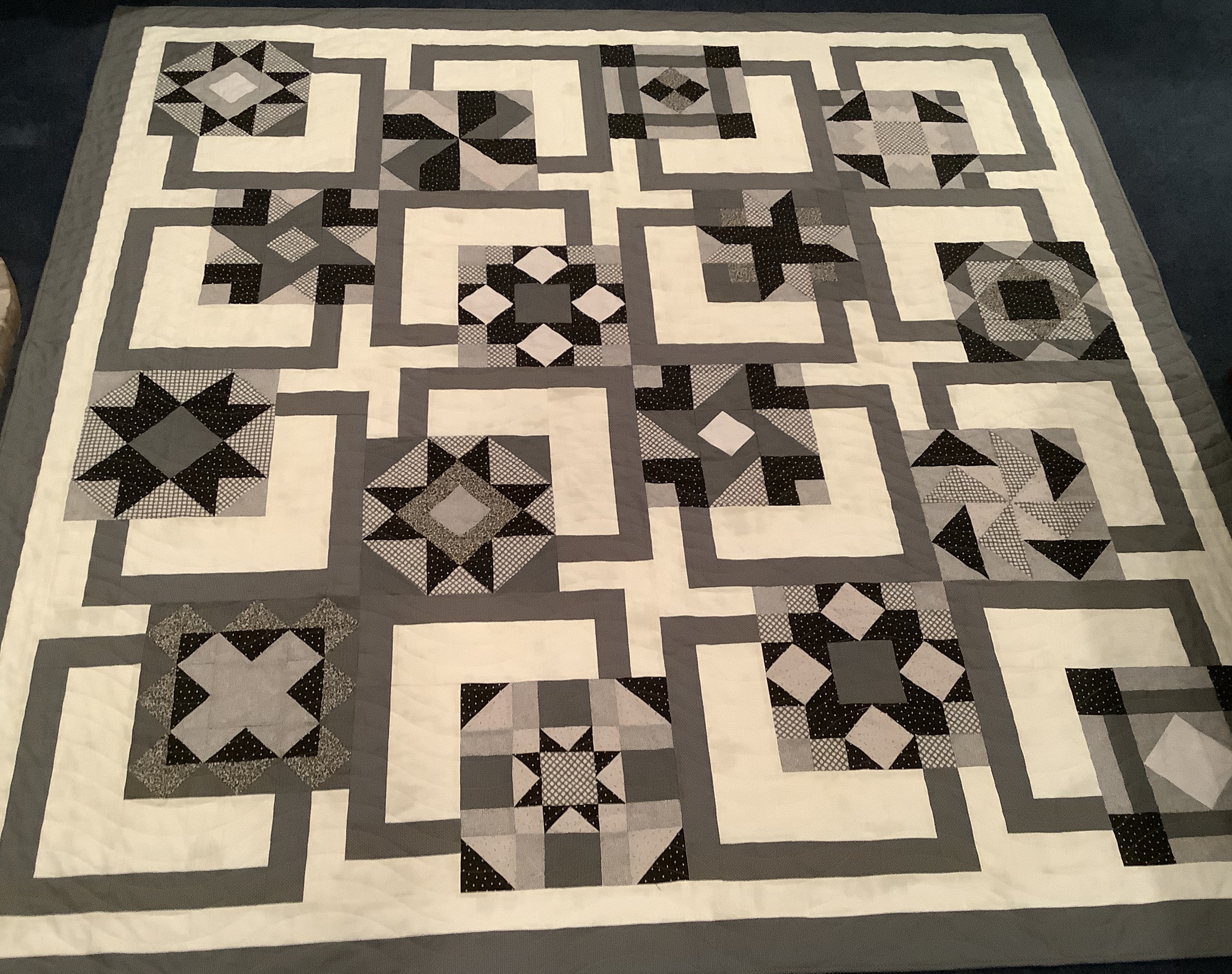 “Treading the Stairs” at MSQC led to this fun counterpane, cited “Thread the Stars” by Kimberly Jolly. Starring “Sunday Stroll“. *Sashing & borders my opus.
