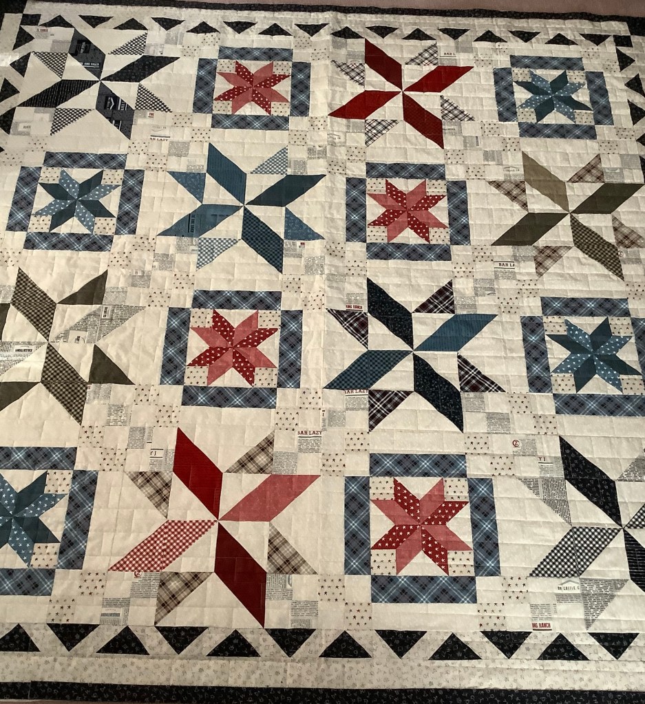 Star-Struck when found this STAR STRIPED – SUNWASHED pattern by Corey Yoder. Addition on back really ‘brings it home’ on this 70th quilt for my summer fun, and just in time for b’day #70 as well 😉 [Quilted by UVQ w/ Circles and Lines design.]