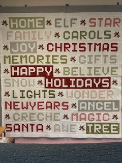 Such a fan of this ‘On Dasher‘ line by Sweetwater used for the LtSanta Quilt previous, and the Sawtooth Christmas Throw by S.McConnell, had to add to my holiday collection! Perfect for the Grandkids to snuggle by the fire Christmas Eve and it’s even Word-alicious;). #72, but who’s counting…HO!HO!HO!